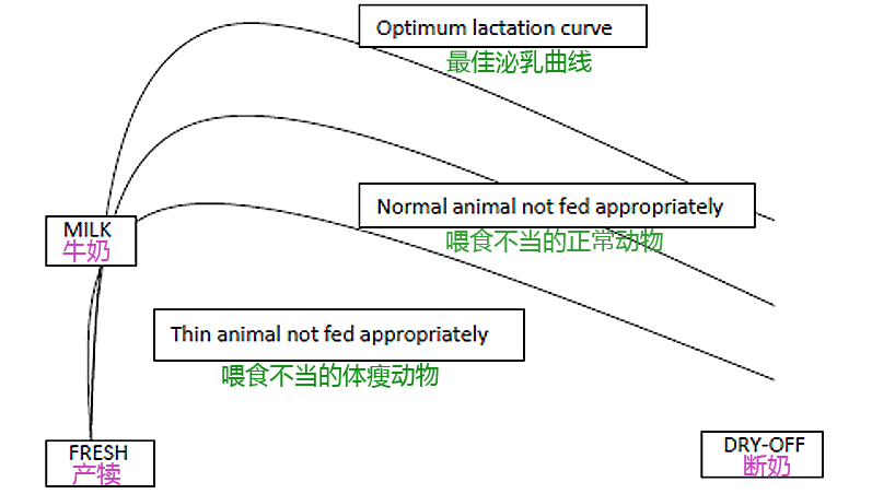 底下的曲線(xiàn)是產(chǎn)犢時(shí)體瘦的牛,她進(jìn)食不足無(wú)法保持體重,無(wú)法到達(dá)產(chǎn)奶高峰,從開(kāi)始產(chǎn)奶曲線(xiàn)就下滑。這樣的奶牛不但不給農(nóng)場(chǎng)產(chǎn)出利潤(rùn),還可能耗費(fèi)牧場(chǎng)的經(jīng)營(yíng)成本。但這不是她的問(wèn)題;是我們對(duì)她管理不當(dāng)。