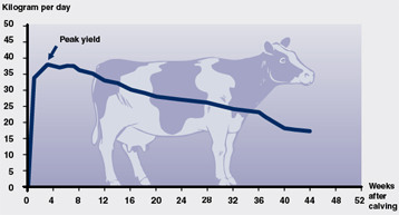 在下面的圖表里,上面的曲線(xiàn)是理想的泌乳曲線(xiàn);奶牛產(chǎn)犢,奶量增加并達(dá)到產(chǎn)奶高峰,然后產(chǎn)奶量緩慢下降,直至停止擠奶。這是一個(gè)理想曲線(xiàn), 只能在牛產(chǎn)犢時(shí)體況評(píng)分為3.5的條件下才能得到。