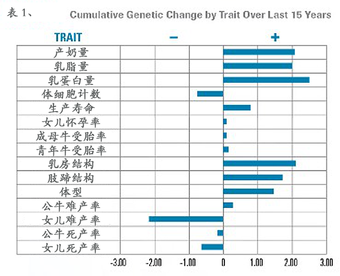 下表1,統計了最近15年或最近三代奶牛的遺傳改進。所有性狀的估計育種值都統一做了校正,使他們之間的相關性一致,可以相互比較。