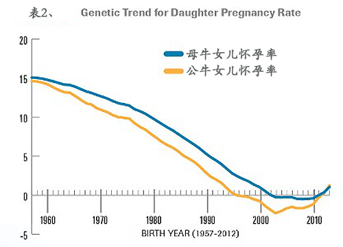 結合表2,我們發現女兒懷孕率(DPR)的遺傳進展曾經非常糟糕但是已經開始觸底反彈了,除了DPR之外,相關的新性狀諸如成母牛受胎率和青年牛受胎率也都有所改進。另外,相比十年前,在最近五年的體細胞和產犢性狀方面也有明顯改善。