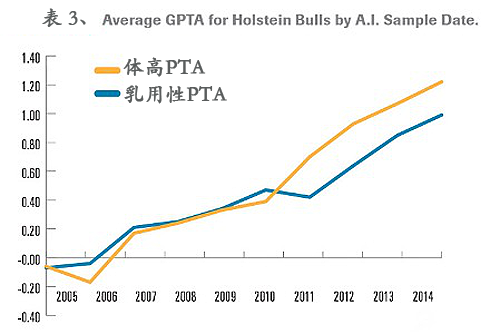 在過去的15年中,所有相關體高和乳用性的估計育種平均值都在不斷增加。更糟糕的是表3對2010年之后各大育種公司培育的公牛做基因檢測,結果顯示其體高和乳用性PTA在不斷的增加。這兩者的急速增加意味著這些公牛的首批后代在體高上會有明顯的增加,也就是從現在起五年后的那批泌乳牛。已經有非常多的牧場主注意到這兩個性狀并發出警告,如果再不做出改變,很多奶牛會喪失其最佳的生產性能和經濟收益。