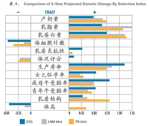 為了比較ICC$和其它選擇指數,我們選取了ICC$、LNM$和TPI各自前10%的公牛,并計算了它們在五年后各性狀的估計育種值PTA。詳見表4,各性狀都做了標準化處理以便于比較。