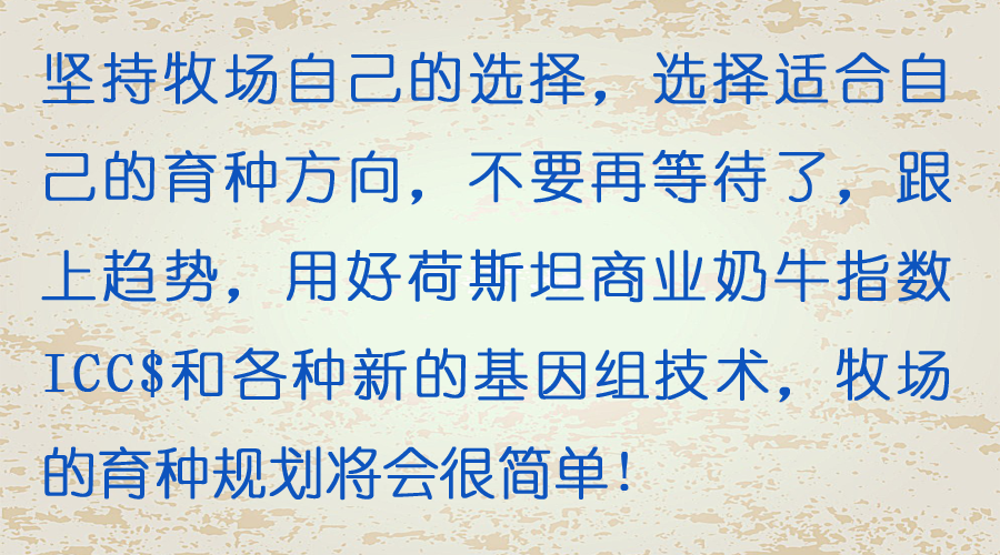 在強調奶產量、奶牛健康和乳房結構的同時,使用ICC$指數還能夠極大的減少已達臨界值的體高性狀,并對相關的產犢難易性、行動性以及可能的飼料效率有所幫助。以后,乳用性這個指標就不僅僅是粗糙的描述了,還會將體高適中納入考量。